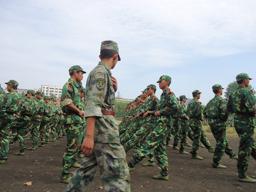 今天的训练内容是走正步、齐步和摆臂练习。伴随着教官的口号,同学们在反复练习着动作,虽然这样的训练有一定的枯燥性,但是同学们还是积极认真地接受训练。休息时间,教官还组织同学们进行唱歌拉歌活动,“叫你唱,你就唱,扭扭咧咧不像样”等拉歌词的应用,同学们都唱的不亦乐乎,让同学们在歌声中得到放松。“累,但快乐着”一位来自内蒙古的园林1班的唐同学道出了大家的心声。